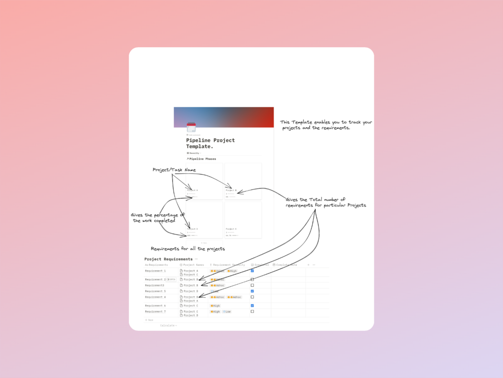 It keeps track on the number if requirement for each project and the percentage of the work completed.